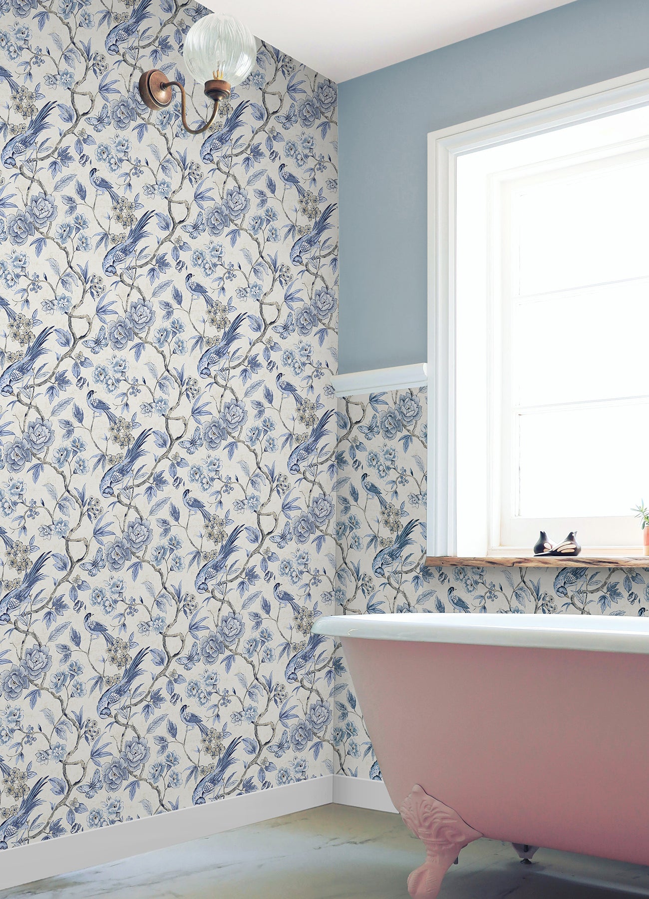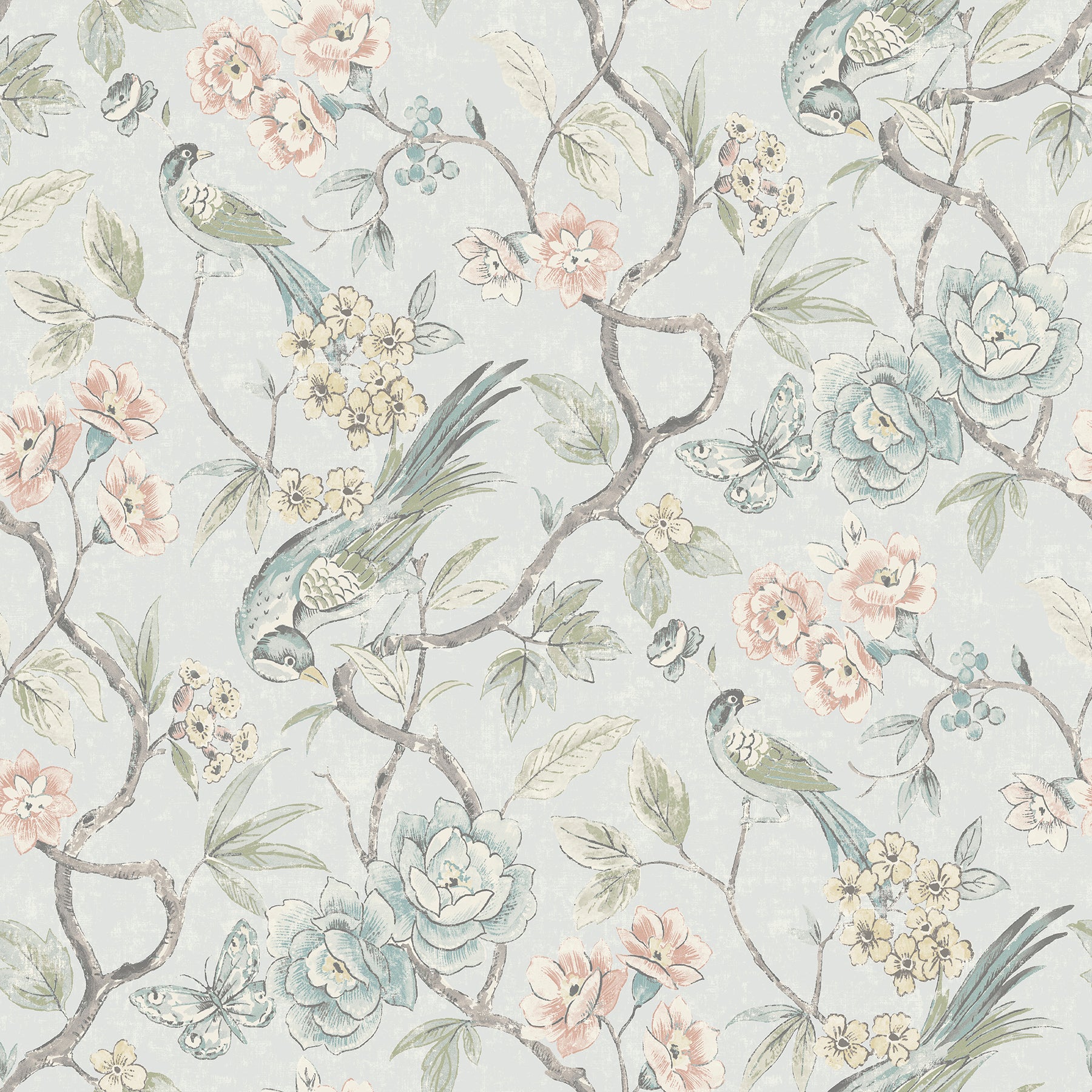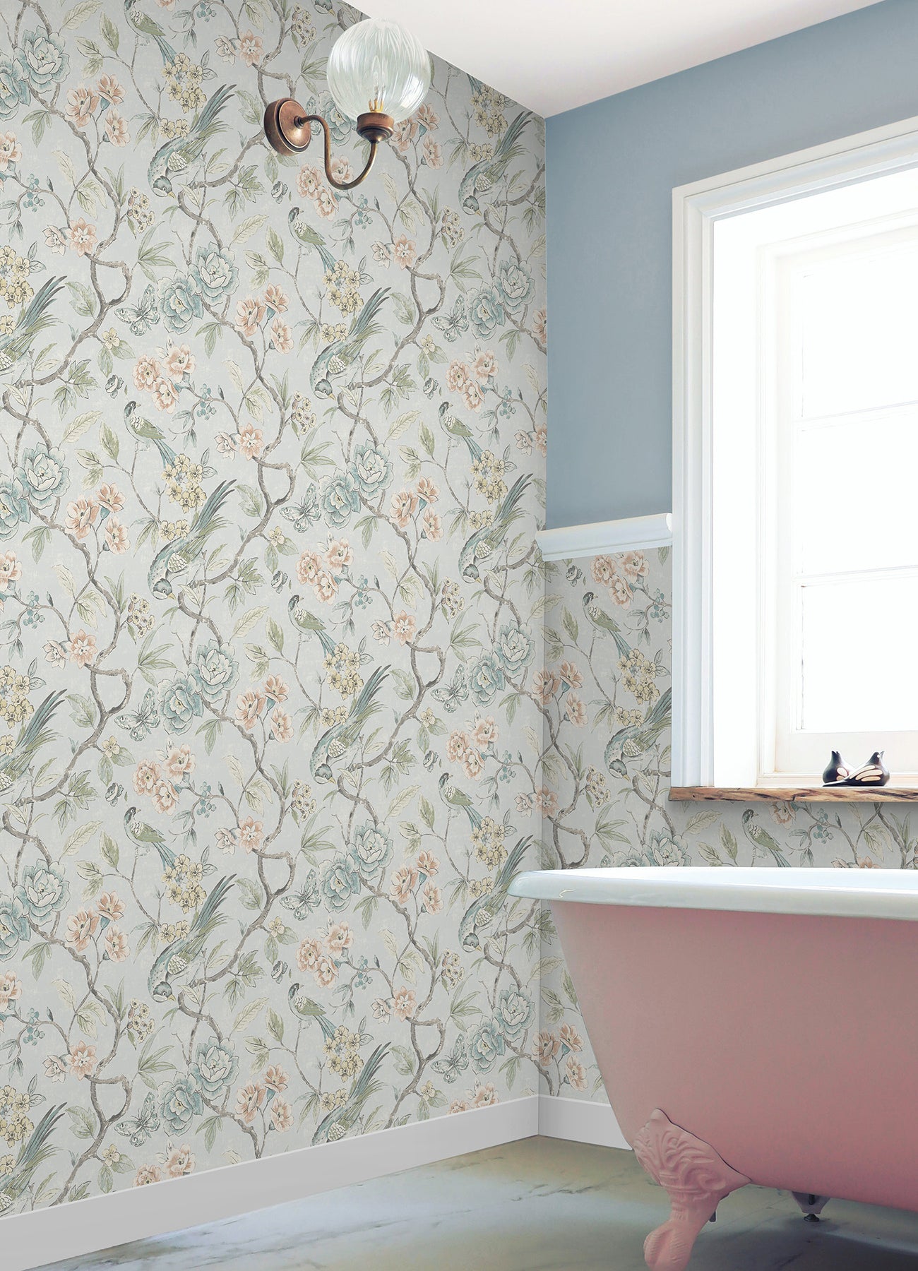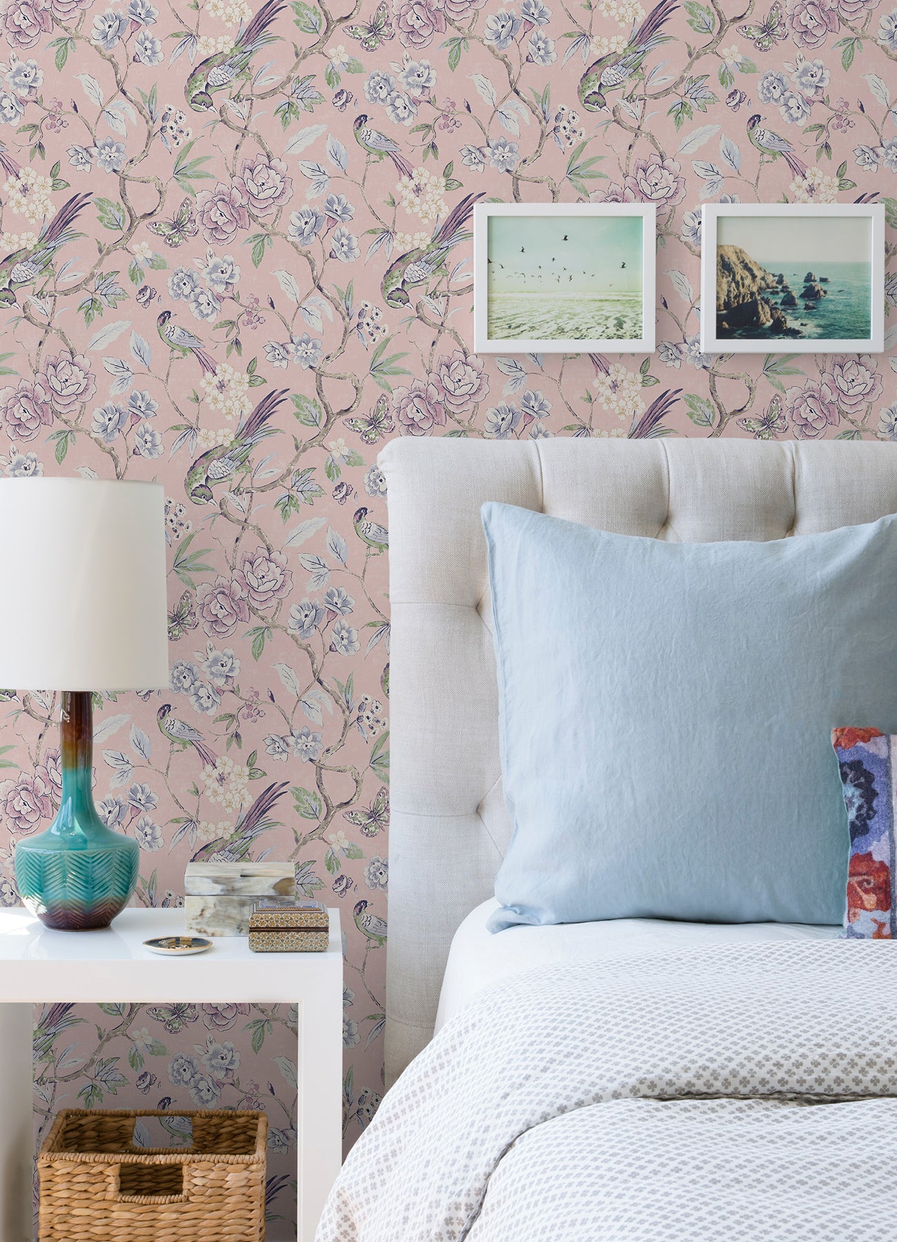 Bring timeless elegance to your space with this Waverly peel and stick wallpaper. Delicate birds perch among blooming florals in soft shades of lavender, blue, and cream, all set against a blush pink backdrop. The intricate design adds a romantic, chinoiserie charm to walls—perfect for bedrooms, powder rooms, and more.