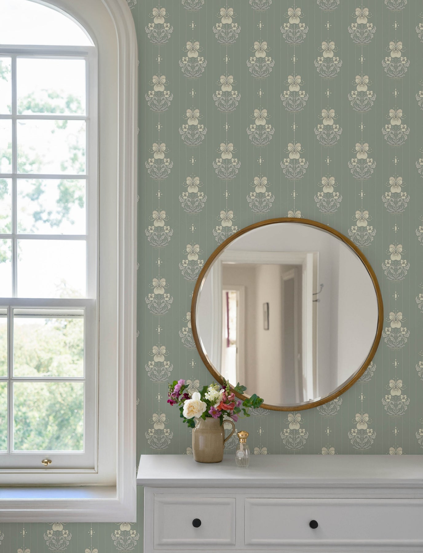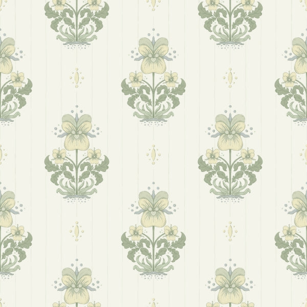A trio of pansies connected by a central stem form offset columns embellished by small, dotted medallions and a delicately striped backdrop.