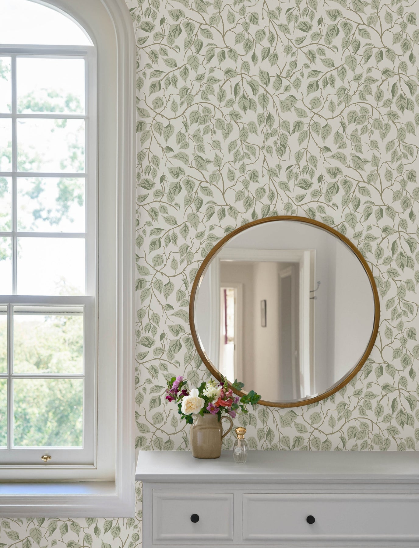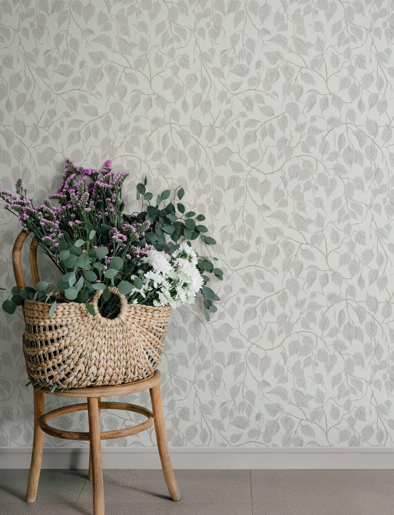 This serene woodland design features winding vines laden with veined, pointed leaves.