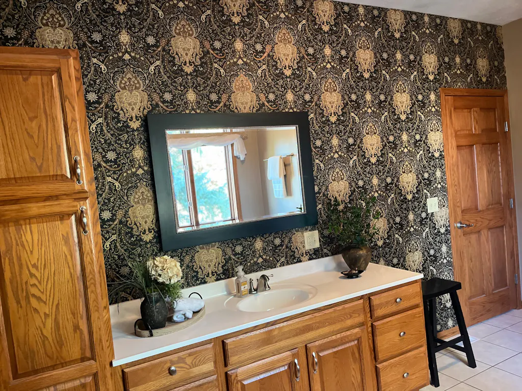 Waverly is known for their style and quality and this paper is no exception. It is a "Seams Right" wallpaper made in the U.S. It has gray backing which eliminates white seams. This is a paper that could be used with many styles of decor and would certainly make a style statement when used as a focal wall as shown in the room photo.